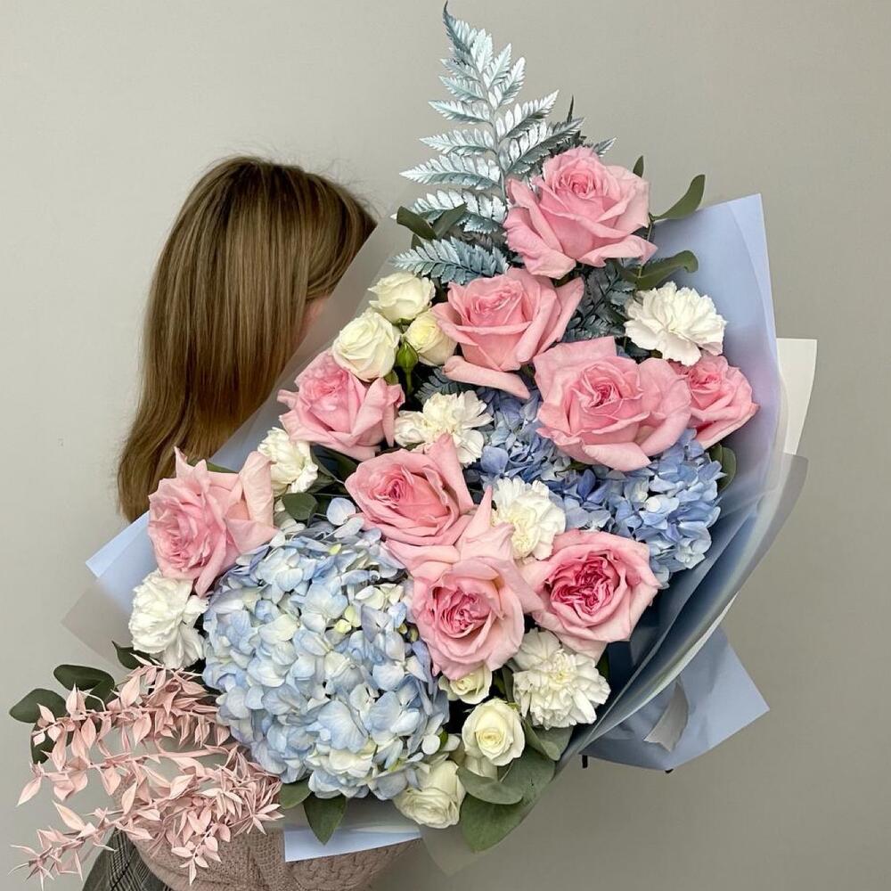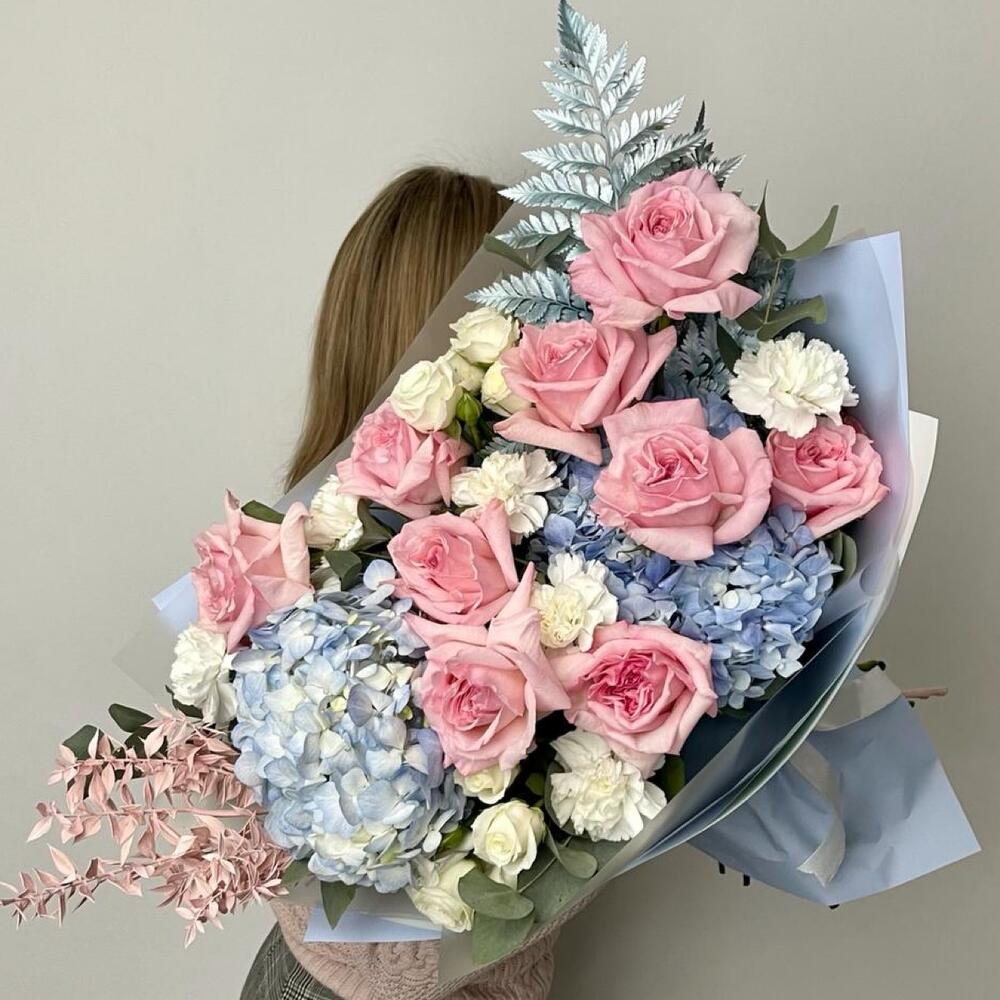 Гортензия – 2 шт.Папоротник – 2 шт.Роза кустовая – 2 шт.Эвкалипт – 2 шт.Роза Эквадор – 9 шт.Диантус – 7 шт.Фисташка – 3 шт.Упаковка дизайнерская – 3 шт.иглица – 2 шт.