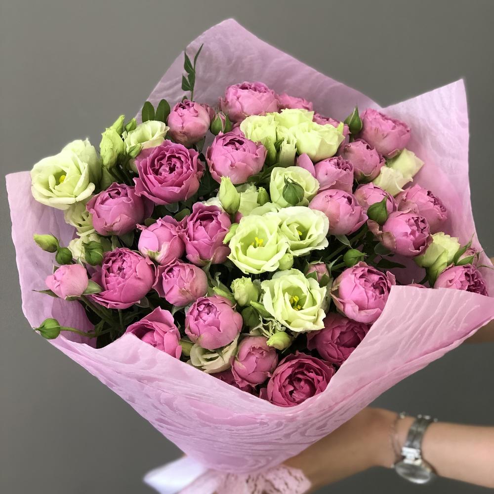 Эустома – 5 шт. Упаковка дизайнерская – 1 шт. Роза misty bubbles – 7 шт.