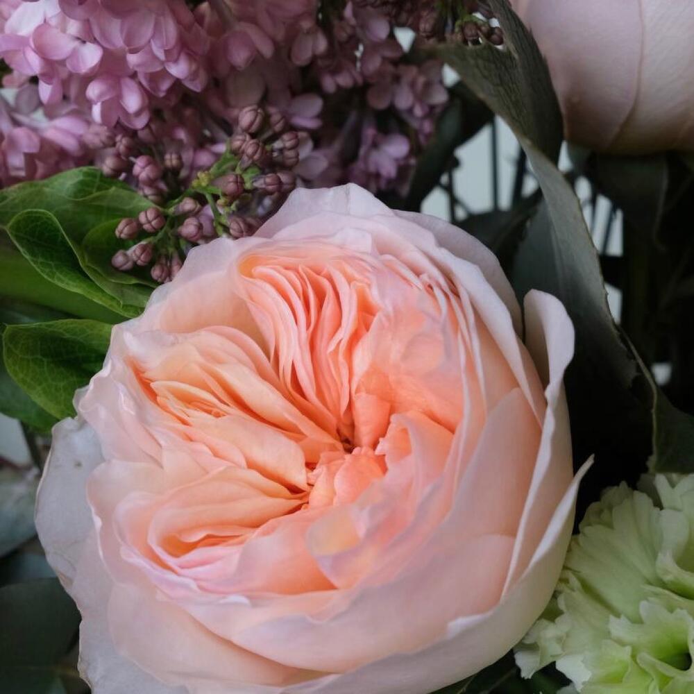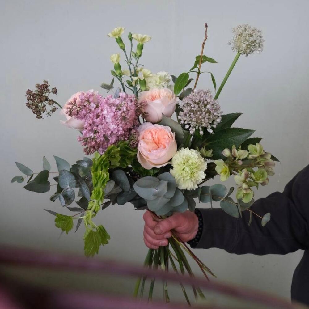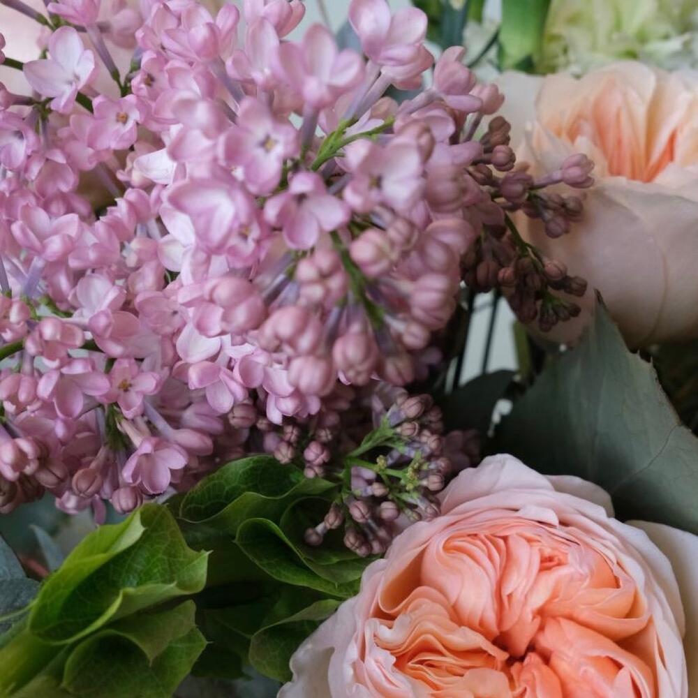 Лента – 1 шт.Сирень – 1 шт.Эвкалипт – 5 шт.Гвоздика – 1 шт.Гвоздика кустовая – 2 шт.Роза пионовидная – 3 шт.Ветка – 3 шт.Морозник – 1 шт.лук полевой – 2 шт.ирландский колокольчик – 1 шт.морковка полевая – 1 шт.