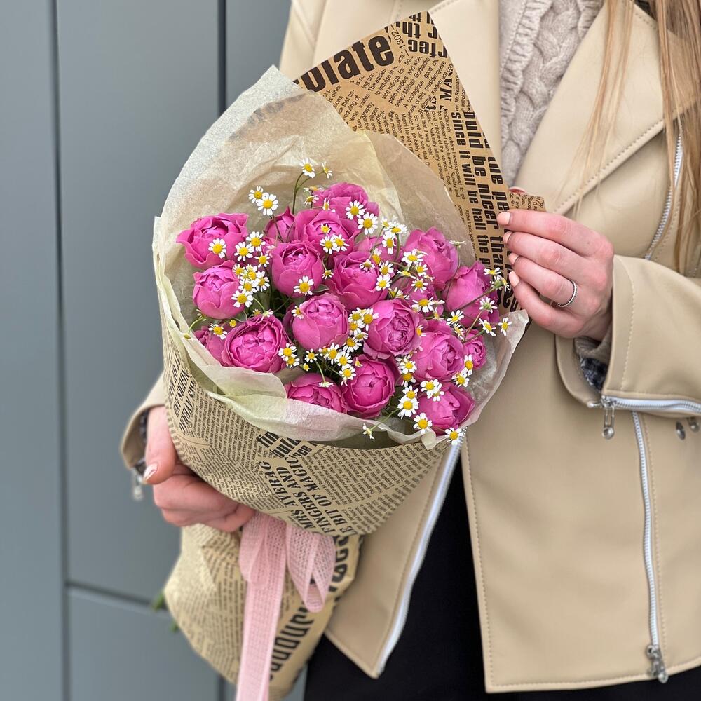 Кустовая пионовидная роза – 5 шт. ромашки (танацетум) – 6 шт. Оформление – 1 шт.