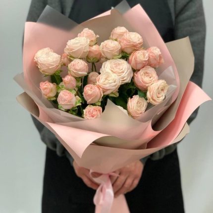 Кустовая роза пионовидная – 101 шт. Открыточка с вашими пожеланиями – 1 шт. Атласная лента – 1 шт.