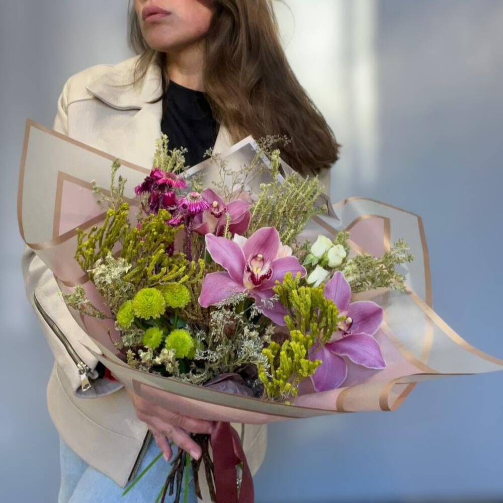 орхидея – 3 шт.Сантини – 1 шт.букет сухоцветов (пучок) – 1 шт.Роза кустовая – 1 шт.Упаковка дизайнерская – 1 шт.Лента атласная – 1 шт.