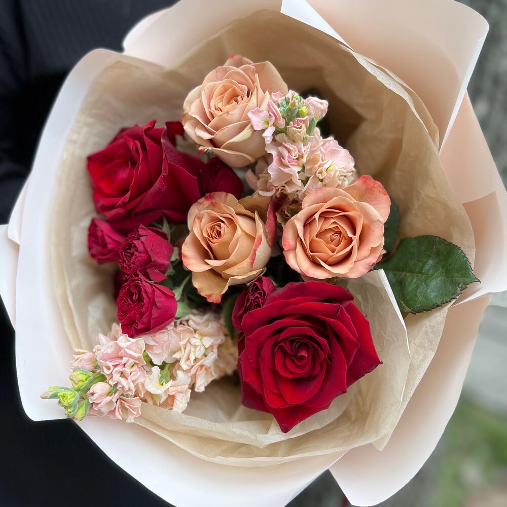 Маттиола – 2 шт.Роза Капучино – 3 шт.Лента атласная – 2 шт.Тишью – 2 шт.Роза Эксплорер – 2 шт.Пленка матовая – 3 шт.роза кустовая пионовидная ред трендсеттер – 1 шт.
