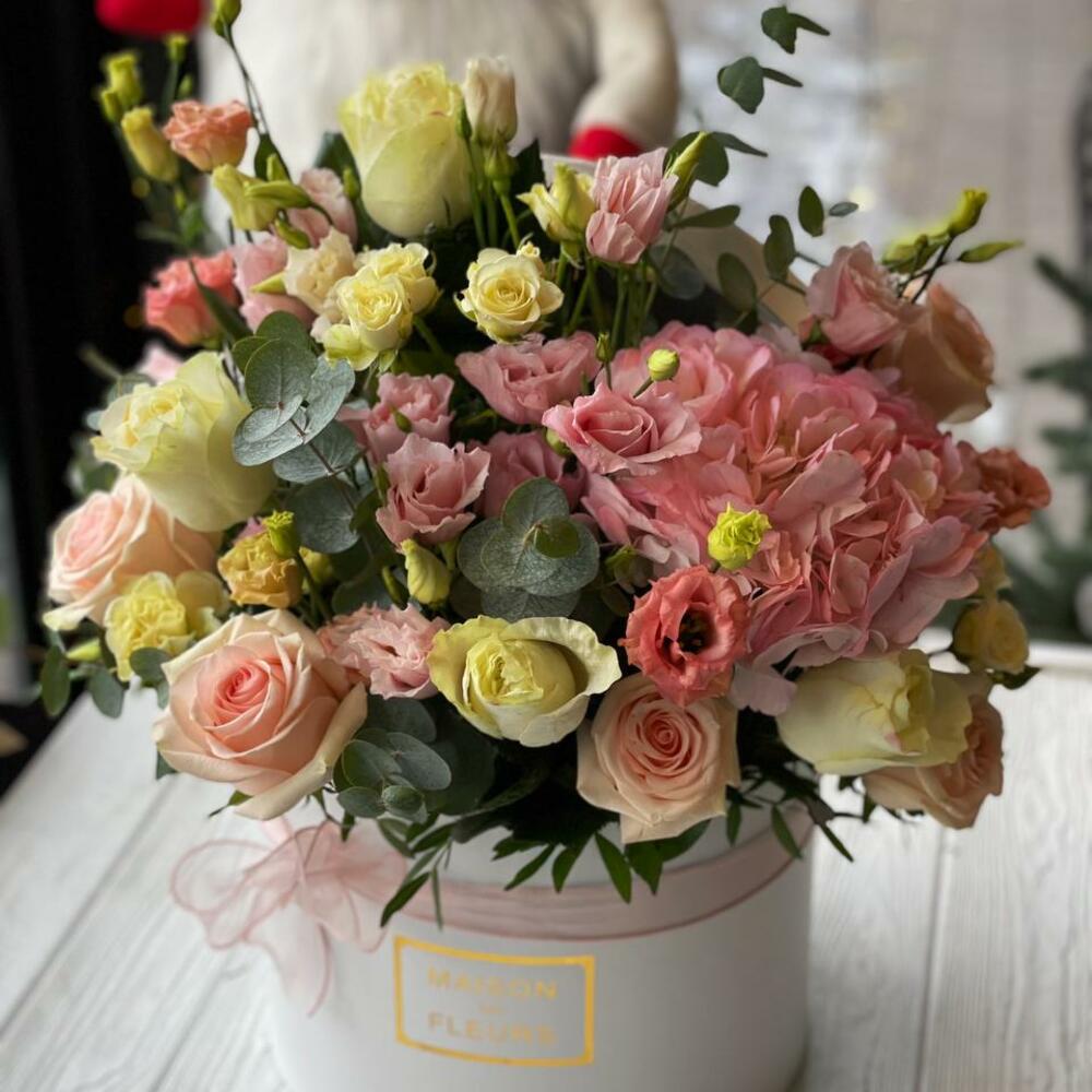 Альстромерии, Гвоздики, Кустовые розы, Лизиантусы, Розы, Хризантемы