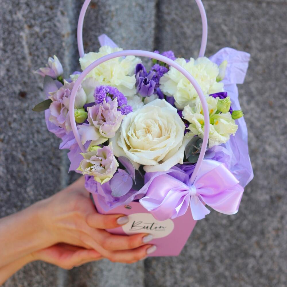 Лизиантус – 2 шт.Эвкалипт – 1 шт.Гвоздика – 2 шт.Роза пионовидная – 1 шт.Сумочка – 1 шт.Открыточка с вашими пожеланиями – 1 шт.Шоколадка – 1 шт.