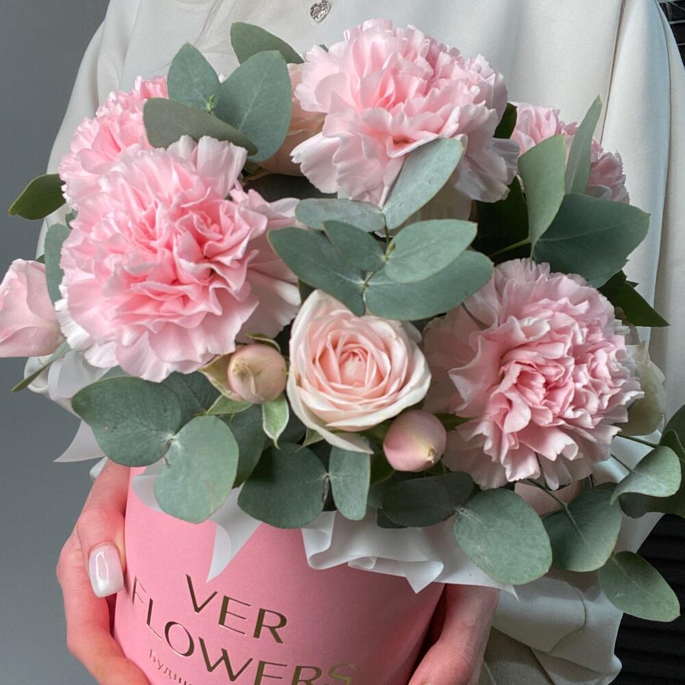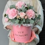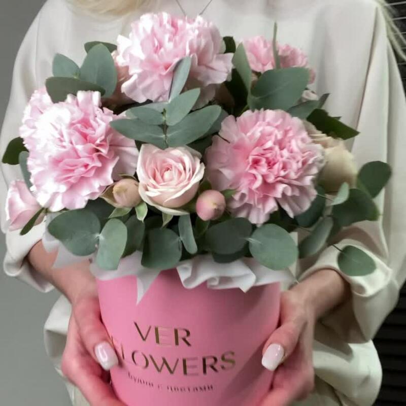 Кустовая роза – 3 шт.Диантус – 6 шт.Коробка – 1 шт.Оазис флористический – 1 шт.