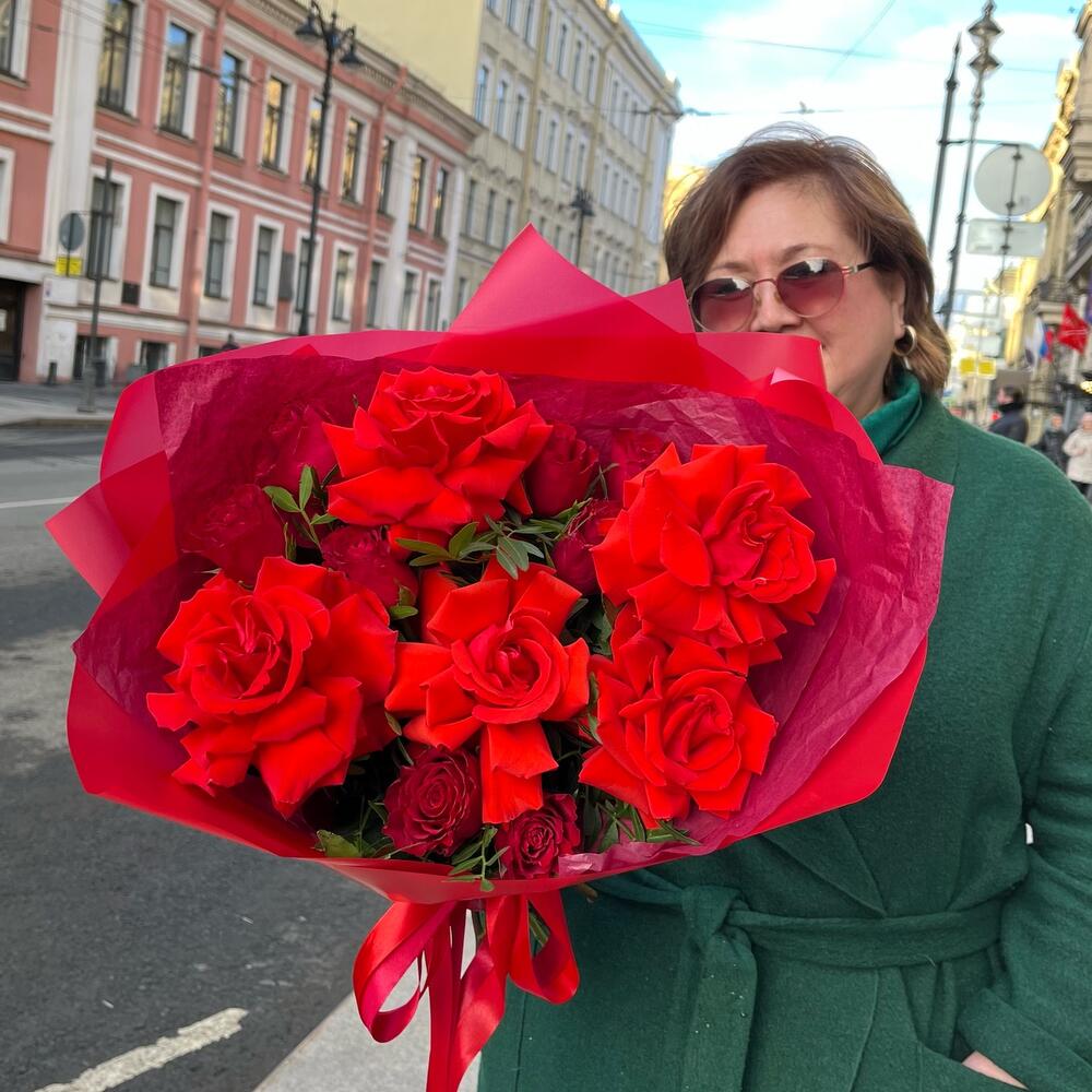 Лента атласная – 1 шт.Упаковка корейская пленка – 1 шт.роза кения красная – 8 шт.фисташка зелень – 4 шт.роза французская алая нина – 5 шт.тишью винное – 1 шт.