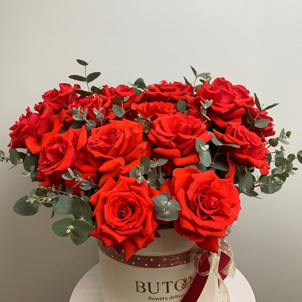 цилиндр 21*21 – 1 шт.Оазис флористический – 2 шт.Роза нина эквадор – 15 шт.Эвкалипт – 10 шт.Лента атласная – 1 шт.