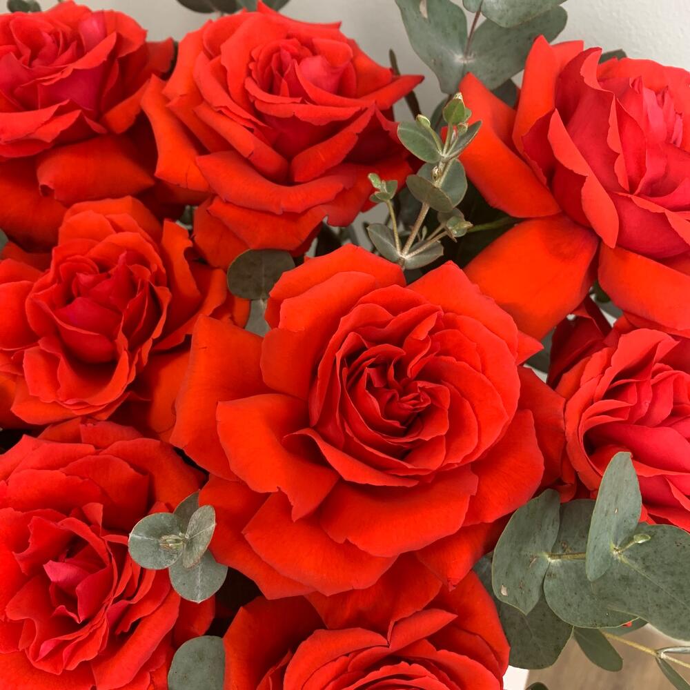 Французские розы в цилиндре с эквалиптом