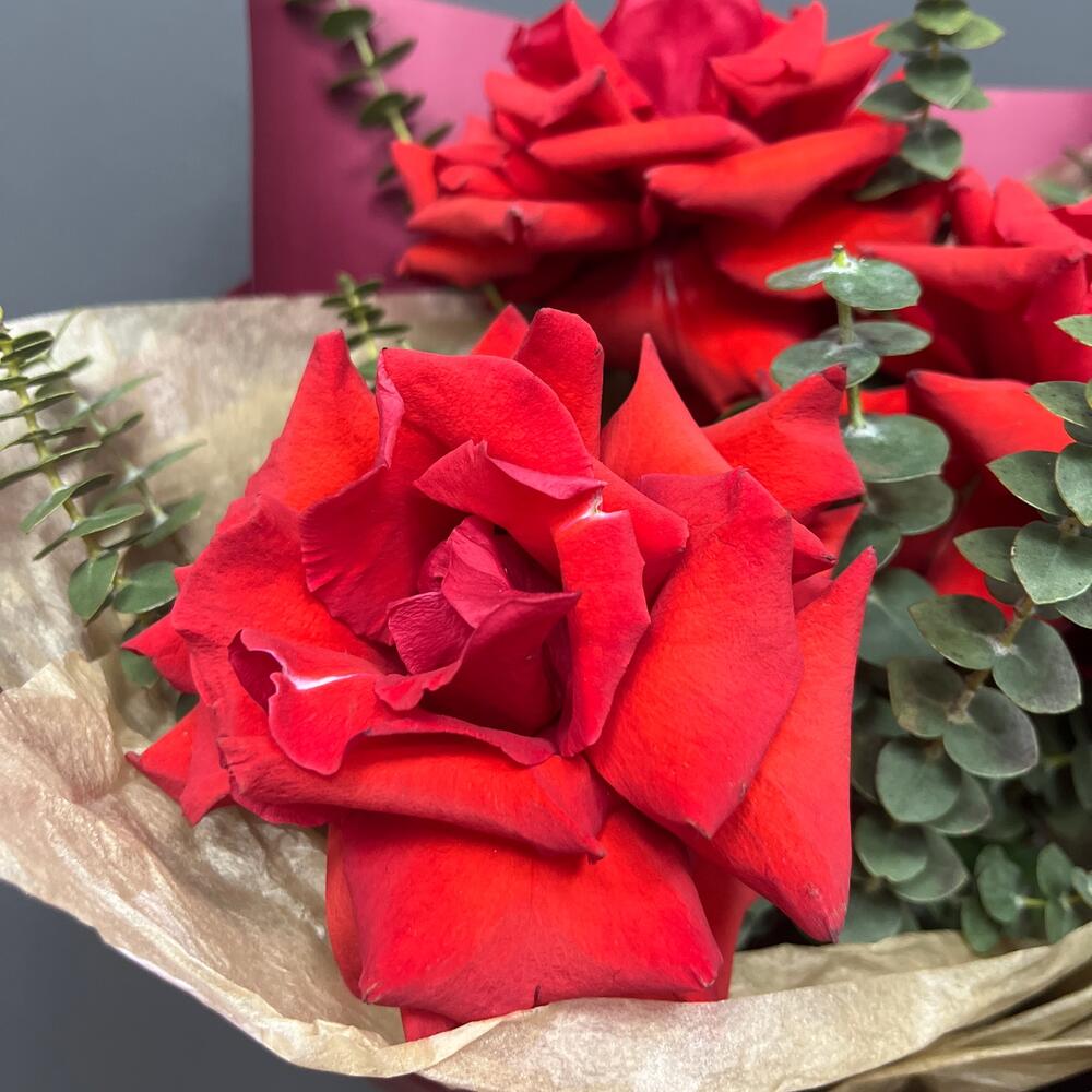 Лента атласная – 1 шт.Тишью – 1 шт.Эвкалипт Baby Blue – 3 шт.Упаковка корейская пленка – 1 шт.роза французская алая нина – 3 шт.