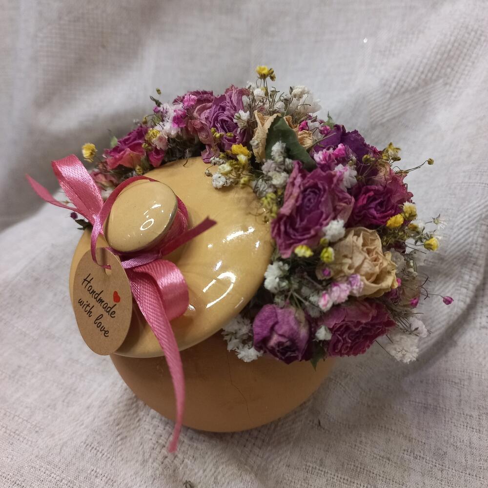 роза кустовая микс сухоцвет – 23 шт.статица сухоцвет – 2 шт.гипсофила сухоцвет – 3 шт.Оазис флористический – 1 шт.горшочек с крышкой керамический – 1 шт.