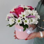 Хризантема кустовая – 3 шт.Лента атласная – 1 шт.Коробка шляпная – 1 шт.Фисташка – 2 шт.Роза Pink Floyd – 3 шт.Статица розовая – 1 шт.Оазис флористический – 1 шт.