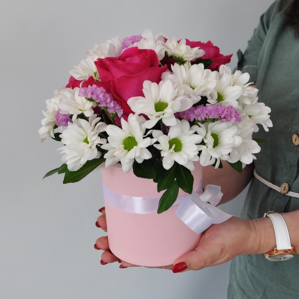 Хризантемы ромашки с розами в коробке «Мамина любовь»