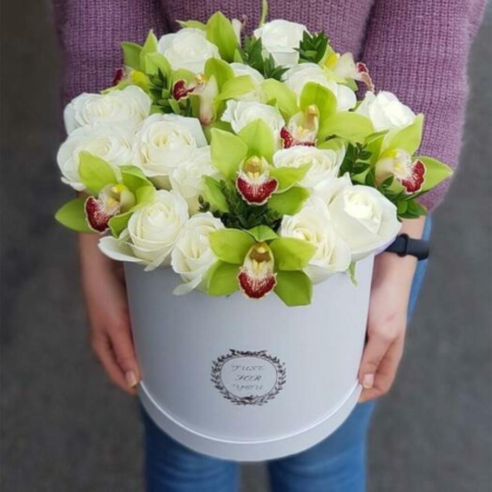 Роза белая – 19 шт.орхидеи соцветия – 13 шт.шляпная коробка в ассортименте – 1 шт.Оазис флористический – 1 шт.