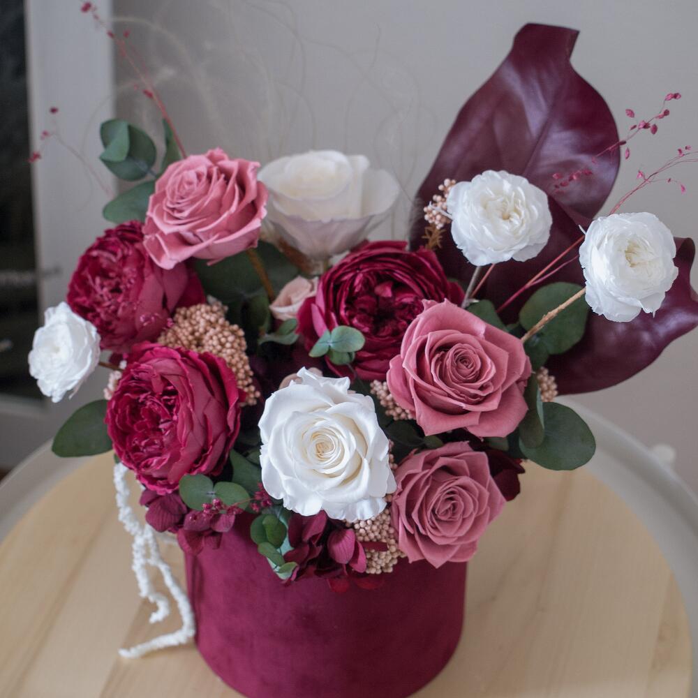 Композиция из стабилизированных цветов в бархатной шляпной коробке