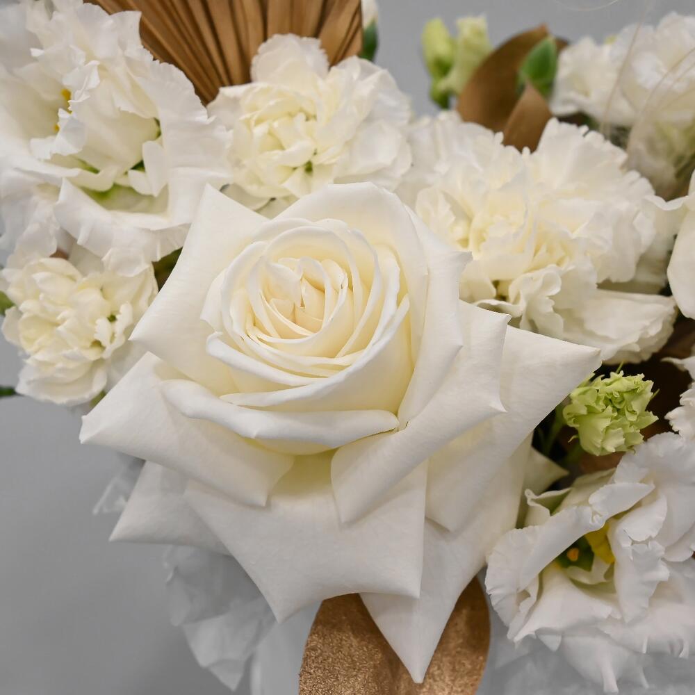 роза пионовидная playa blanca – 1 шт.Гвоздика – 2 шт.Гвоздика кустовая – 2 шт.Эустома – 1 шт.Рускус – 2 шт.Лист пальмы – 1 шт.Ковыль – 1 шт.Шляпная коробка – 1 шт.