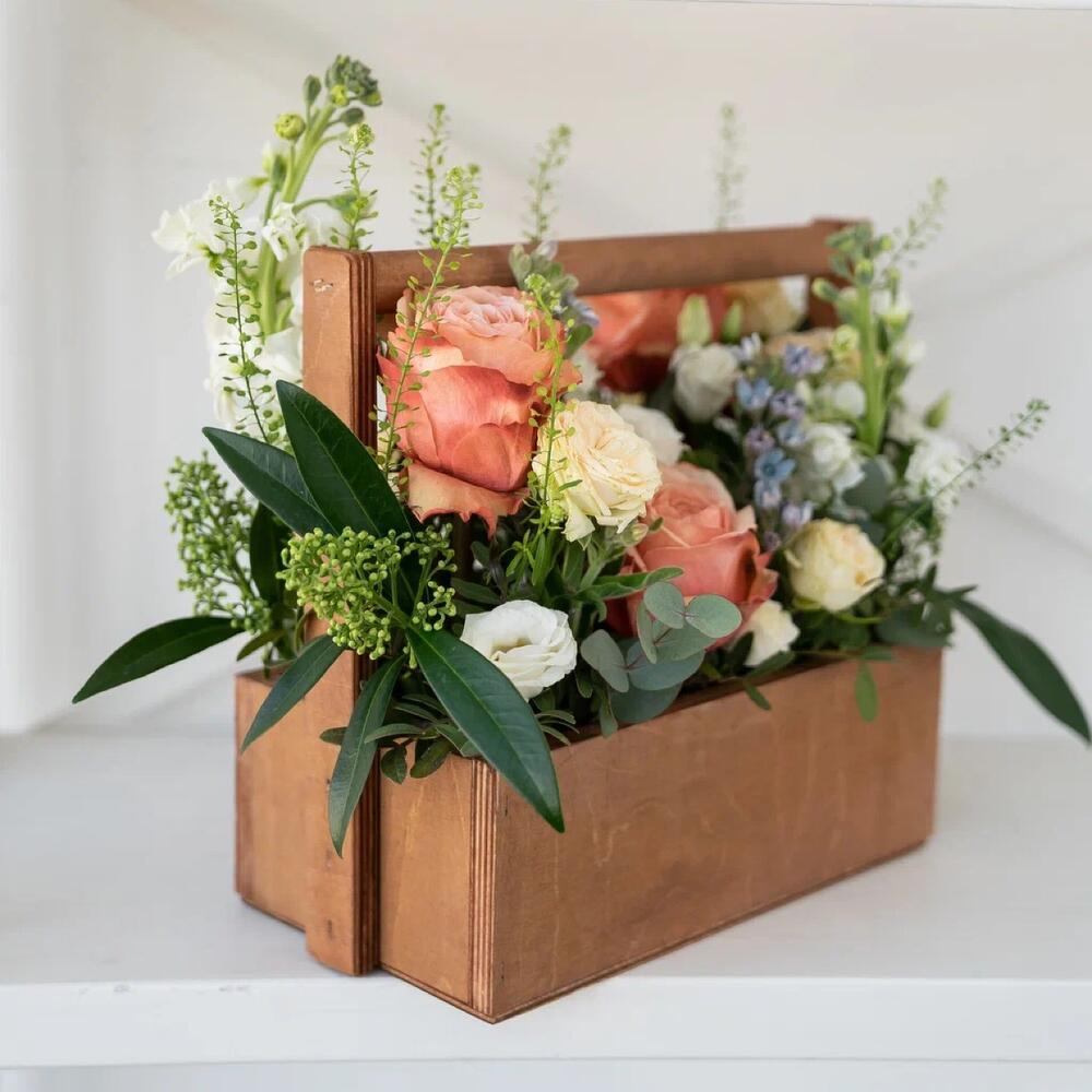 Лизиантус – 4 шт.Маттиола – 2 шт.Эвкалипт – 2 шт.Роза кустовая пионовидная – 3 шт.Скиммия – 3 шт.Гринбелл – 2 шт.Роза садовая – 3 шт.Оксипеталум – 4 шт.Ящик деревянный – 1 шт.Оазис флористический – 1 шт.