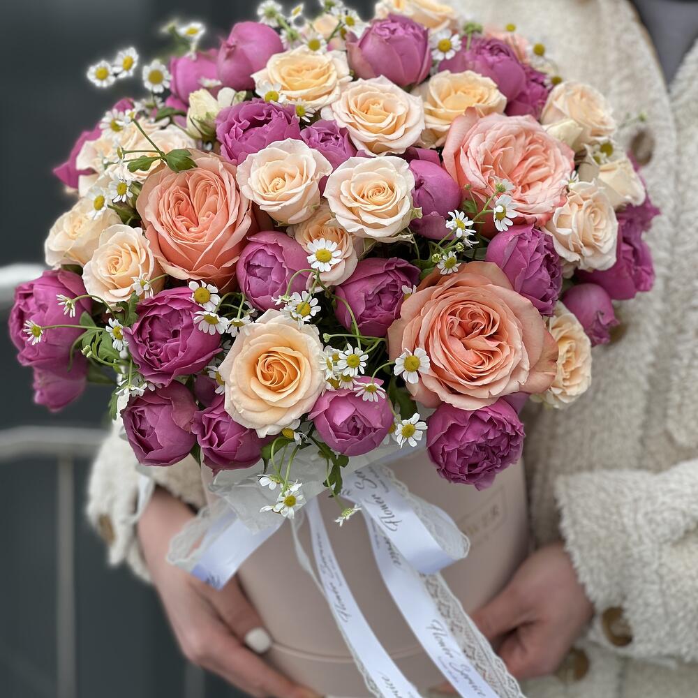 Стильная композиция из игривых ромашек, микса кустовых роз и одноголовых сорта Кахала!