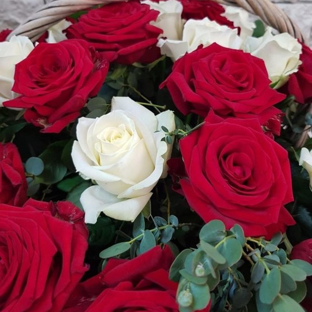 Эвкалипт – 10 шт.Роза Россия 60 см – 51 шт.Корзина плетеная – 1 шт.