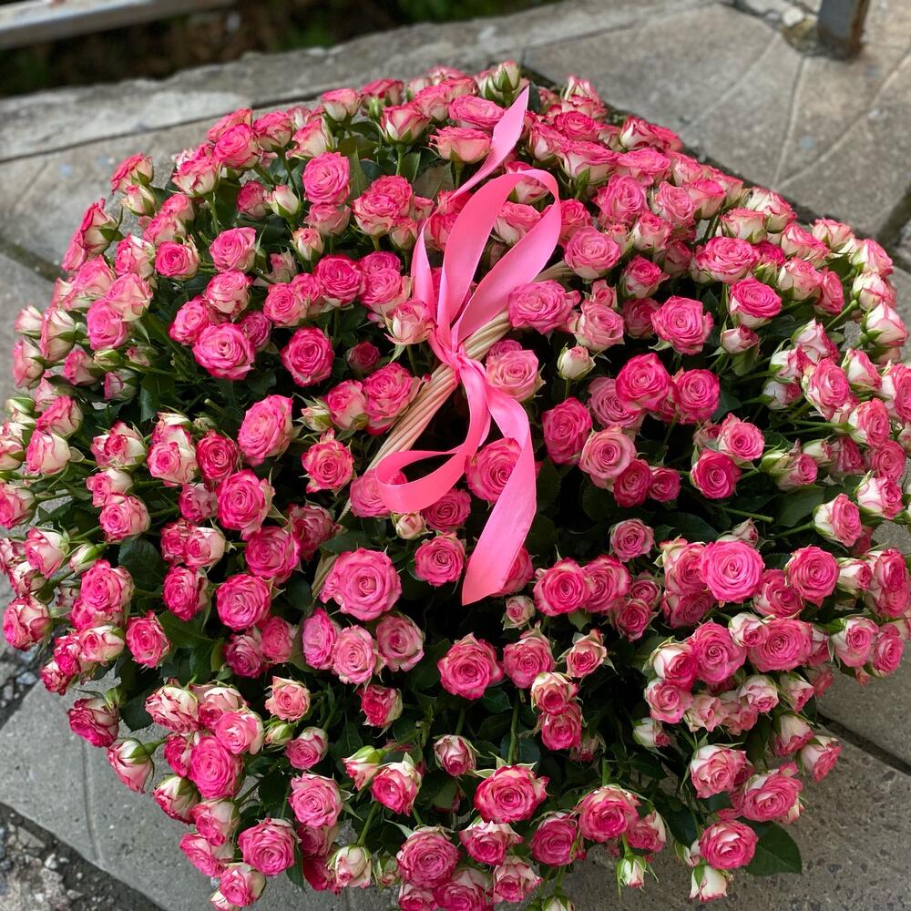 Кустовая роза – 81 шт.Оазис флористический – 2 шт.оформление дизайнерское – 1 шт.Корзина – 1 шт.