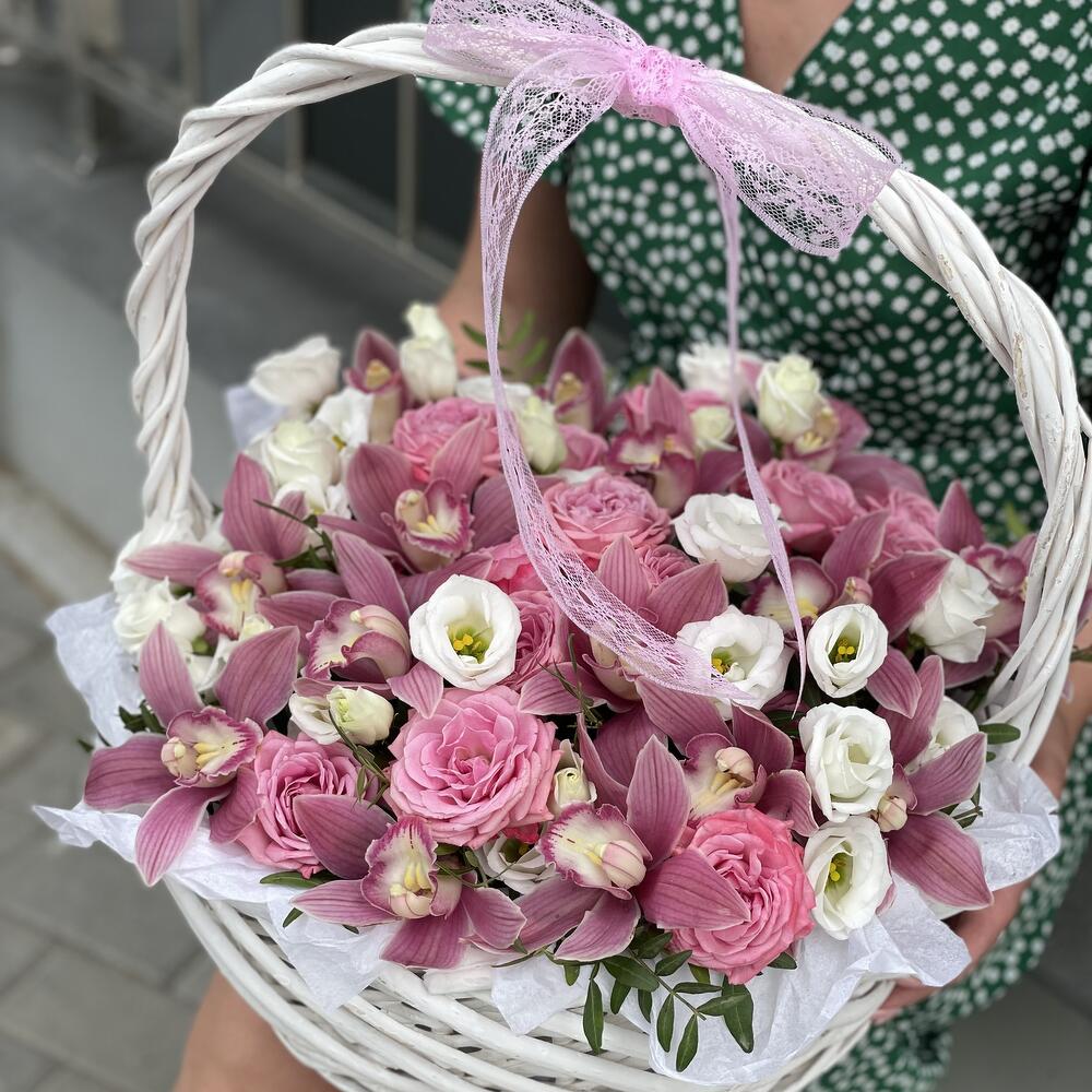 Корзина из цветков орхидеи, роз, эустомы и зелени!