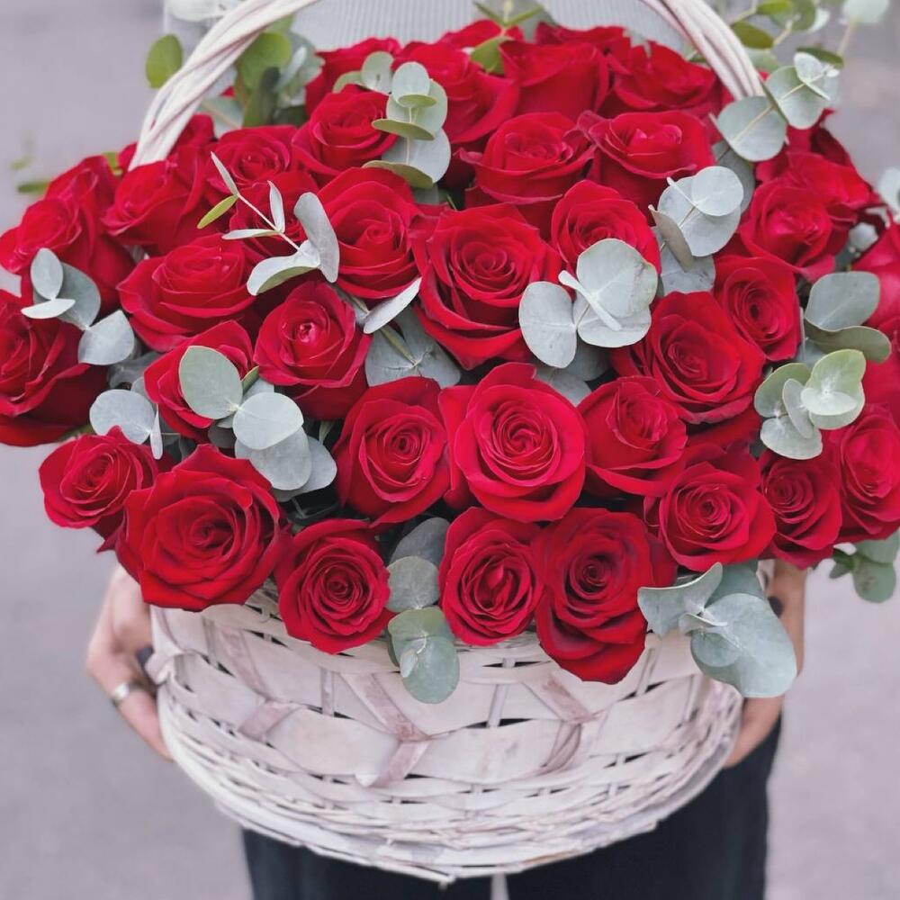 Плетеная корзина – 1 шт.Красная роза – 51 шт.Эвкалипт – 5 шт.Оазис флористический – 3 шт.