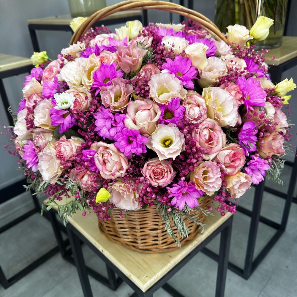Роза – 29 шт. Хризантема – 33 шт. эустомы микс – 11 шт. Корзина плетеная – 1 шт. зелень декоративная – 5 шт.