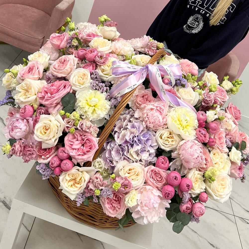 Гортензия – 1 шт.Пион – 10 шт.Пионовидная роза – 25 шт.Лизиантус – 24 шт.Кустовая роза – 15 шт.Статица – 10 шт.Эвкалипт – 10 шт.Корзина плетеная – 1 шт.