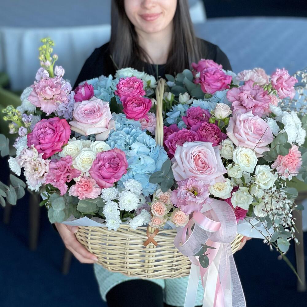 Гортензия – 3 шт.Роза – 8 шт.Лизиантус – 5 шт.Хризантема кустовая – 5 шт.Роза кустовая – 5 шт.Хризантема – 5 шт.Эвкалипт – 2 шт.