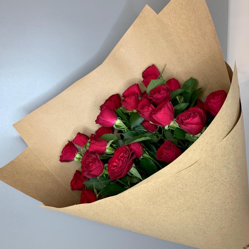 Роза кустовая – 7 шт.Лента атласная – 2 шт.Крафт – 2 шт.