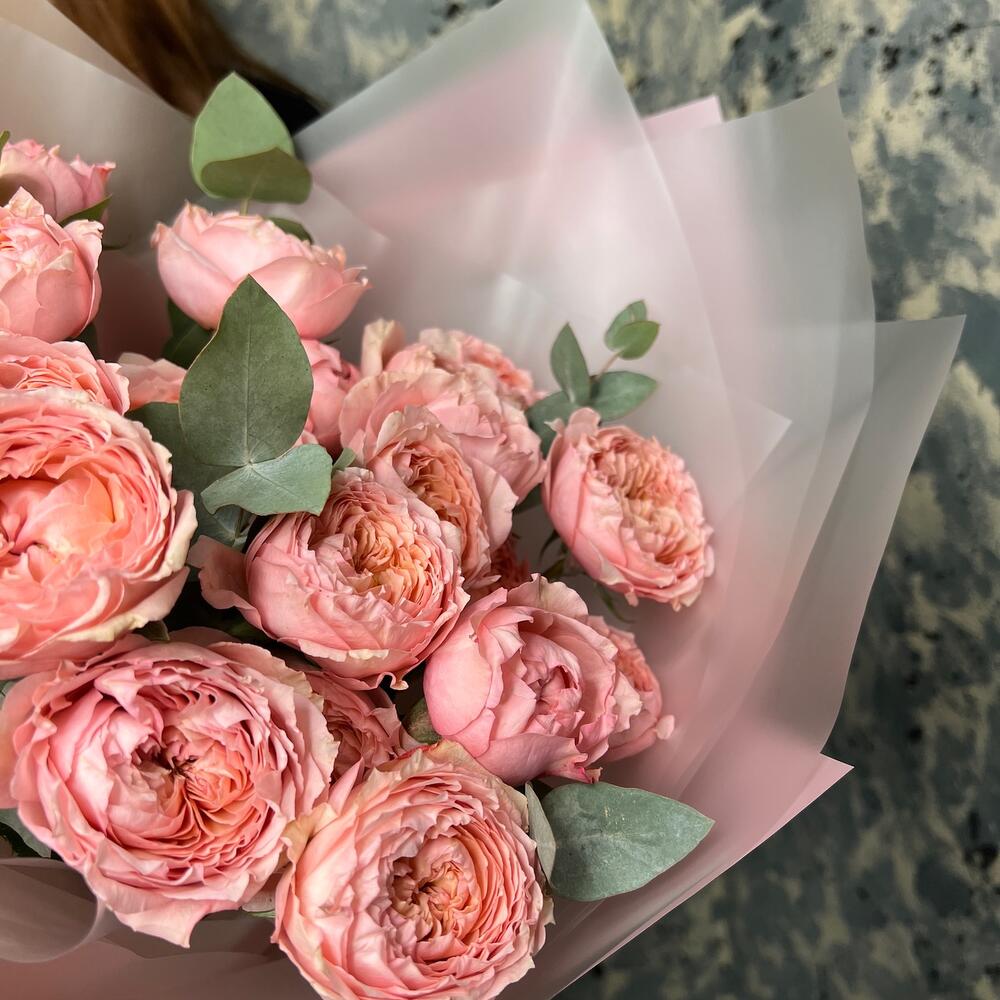 Эвкалипт – 3 шт.Лента атласная – 2 шт.Пленка матовая – 5 шт.роза пионовидная кустовая джульетта – 5 шт.