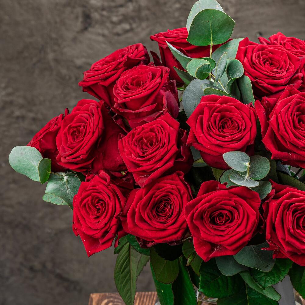 Монобукет из красных роз с эвкалиптом в вазе-букетнице