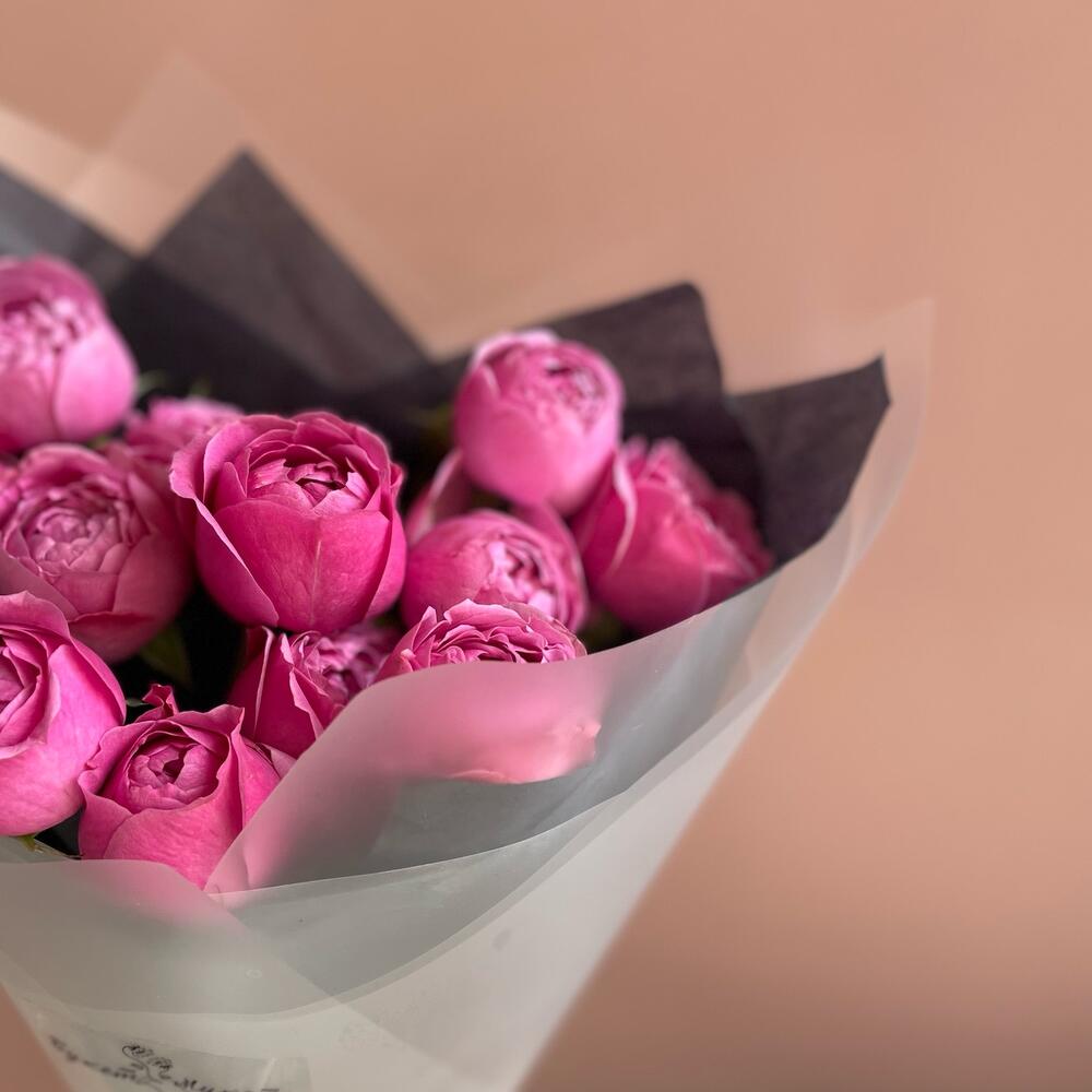 Лента атласная – 1 шт.Тишью – 1 шт.Пленка матовая – 1 шт.роза кустовая пионовидная кения – 3 шт.