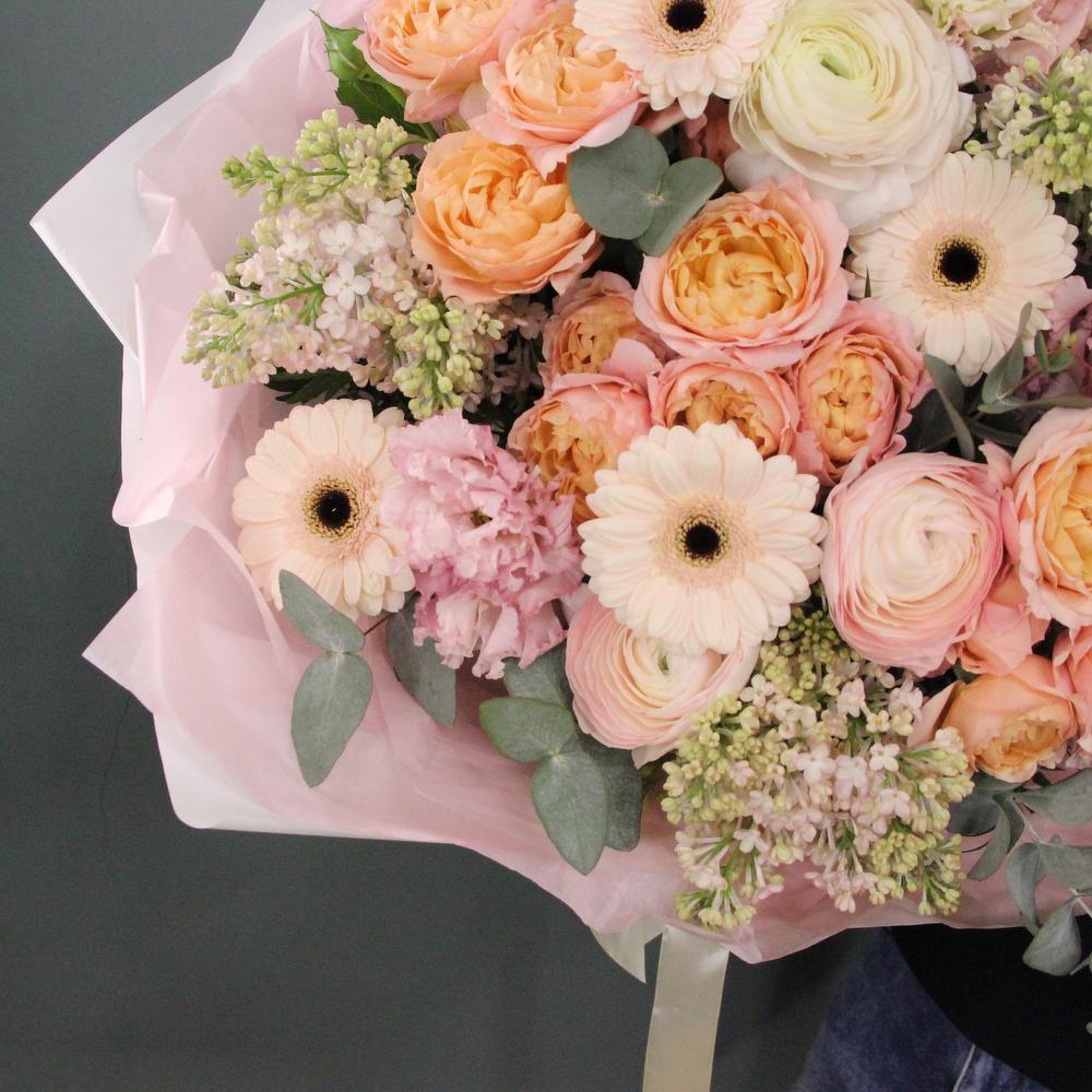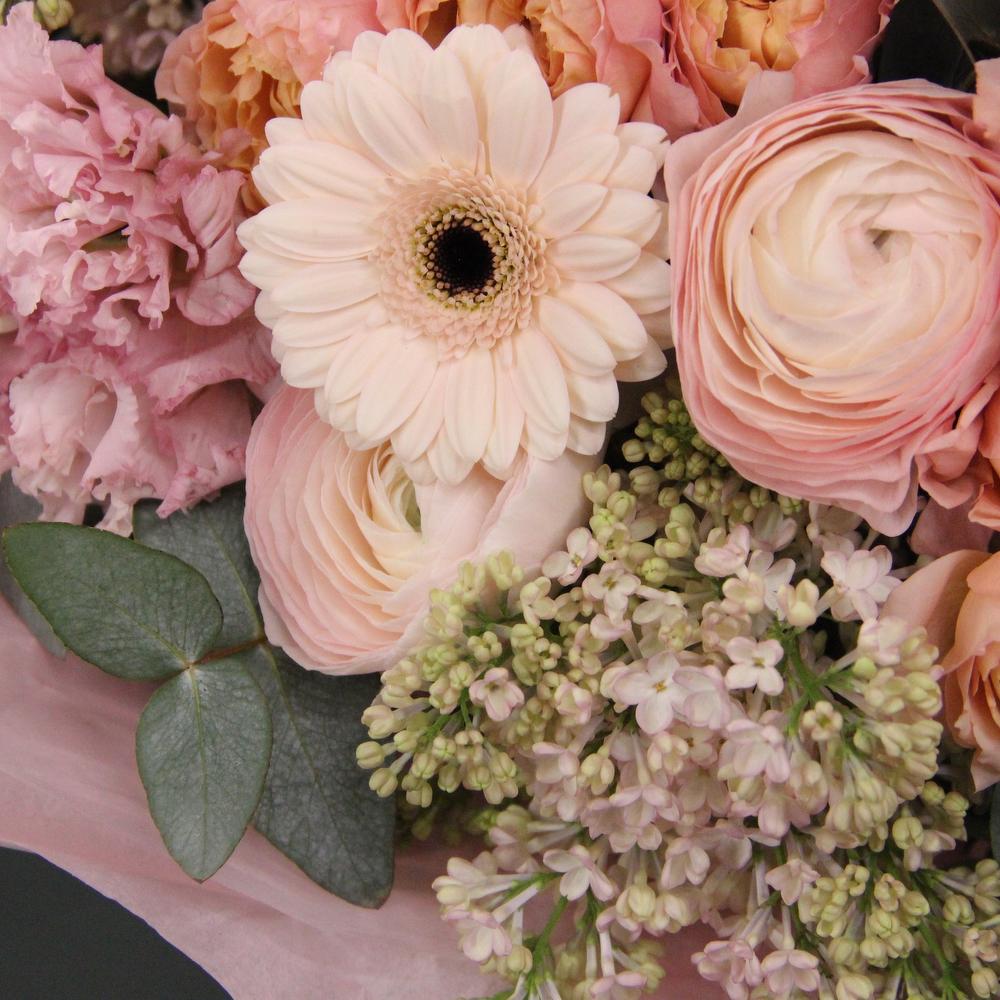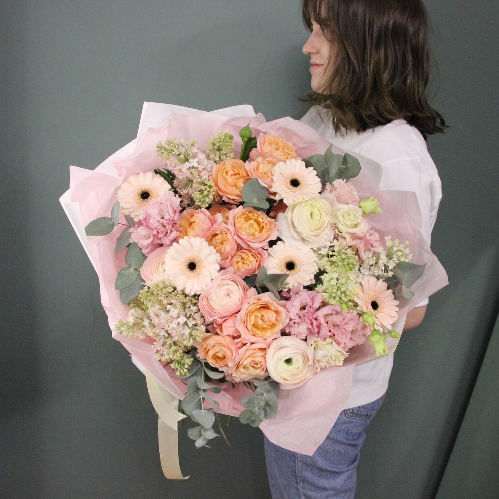 Лизиантус – 3 шт.Гербера – 5 шт.Роза кустовая пионовидная – 4 шт.Эвкалипт – 9 шт.Упаковка дизайнерская – 2 шт.Ранункулюс – 5 шт.Упаковка – 1 шт.