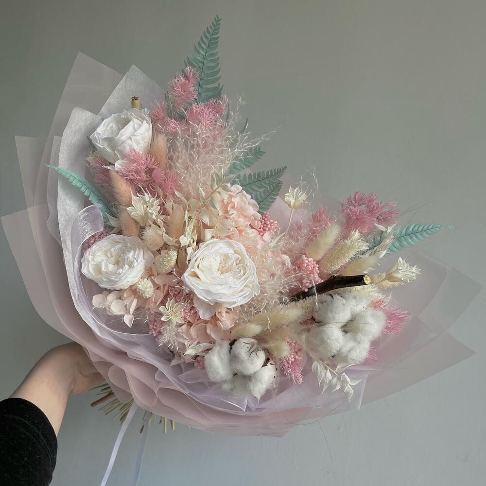 Гортензия – 1 шт.Озотамнус – 2 шт.Папоротник – 1 шт.Рускус – 2 шт.Хлопок – 2 шт.Аспарагус – 1 шт.Упаковка дизайнерская – 1 шт.Роза стабилизированная – 3 шт.Ковыль – 3 шт.Нигелла – 1 шт.Лагурус – 12 шт.Мак – 2 шт.Фаларис – 8 шт.пампасная трава – 1 шт.