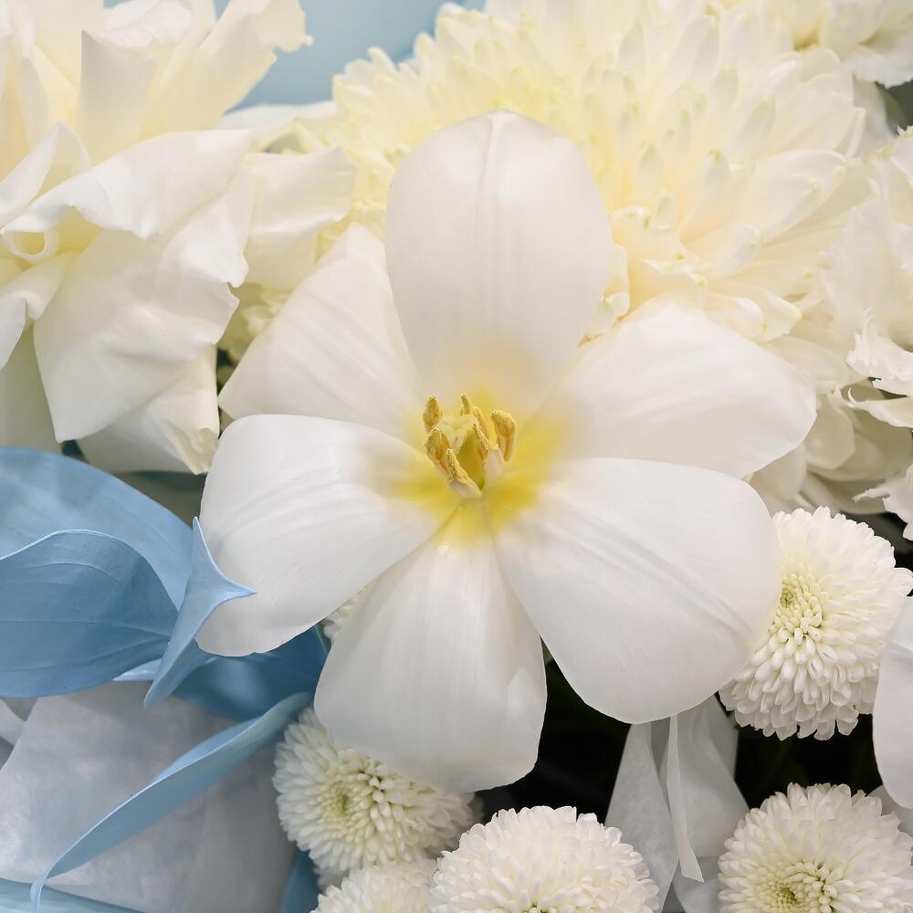 Рускус – 3 шт.Тюльпан – 2 шт.Хризантема кустовая – 3 шт.Хризантема – 1 шт.Гвоздика – 2 шт.Упаковка дизайнерская – 1 шт.Французская роза – 3 шт.