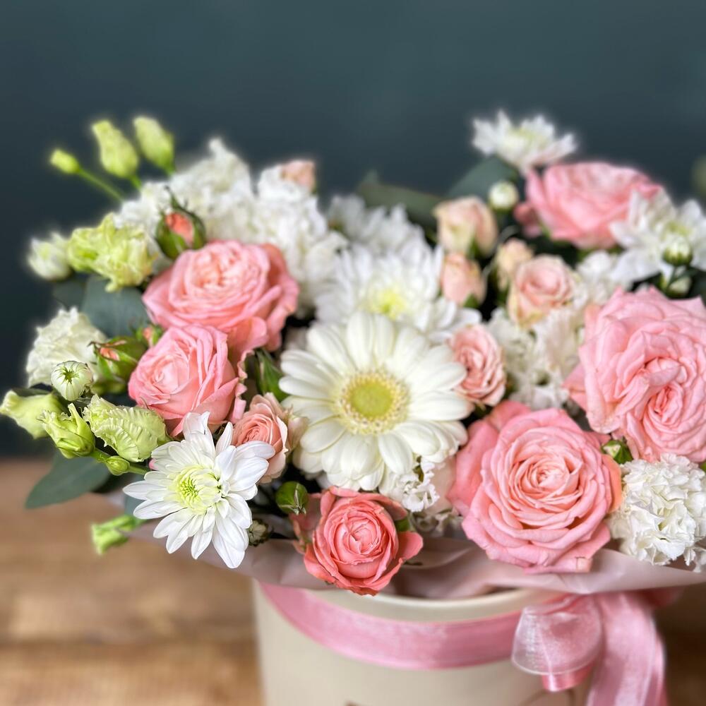 Лента – 2 шт.Гербера мини – 1 шт.Роза кустовая Голландия – 1 шт.Шляпная коробка – 1 шт.Эвкалипт цинерария – 1 шт.роза кустовая мадам бомбастик – 1 шт.мохровая хризантема кустовая – 1 шт.лизиантус мохровой (эустома) – 1 шт.