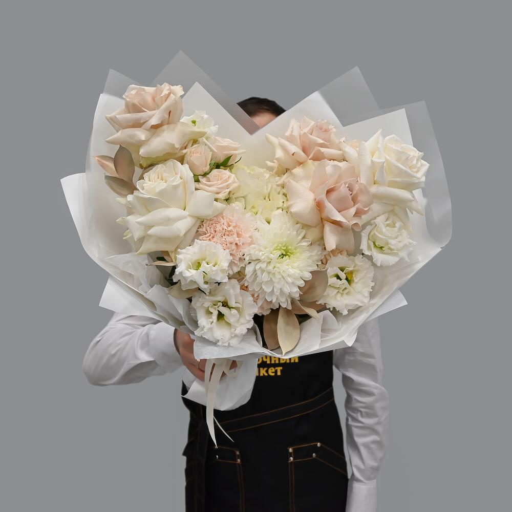 Французская роза – 5 шт.Эустома – 2 шт.Гвоздика – 2 шт.Роза кустовая – 2 шт.Рускус – 3 шт.Хризантема – 1 шт.Гортензия – 1 шт.Упаковка дизайнерская – 1 шт.