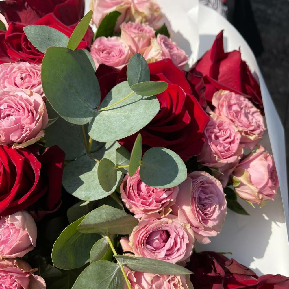 Роза одноголовая – 9 шт.Роза кустовая пионовидная – 8 шт.Эвкалипт – 1 шт.Подарочная упаковка – 1 шт.средство для продления жизни срезанных цветов – 1 шт.