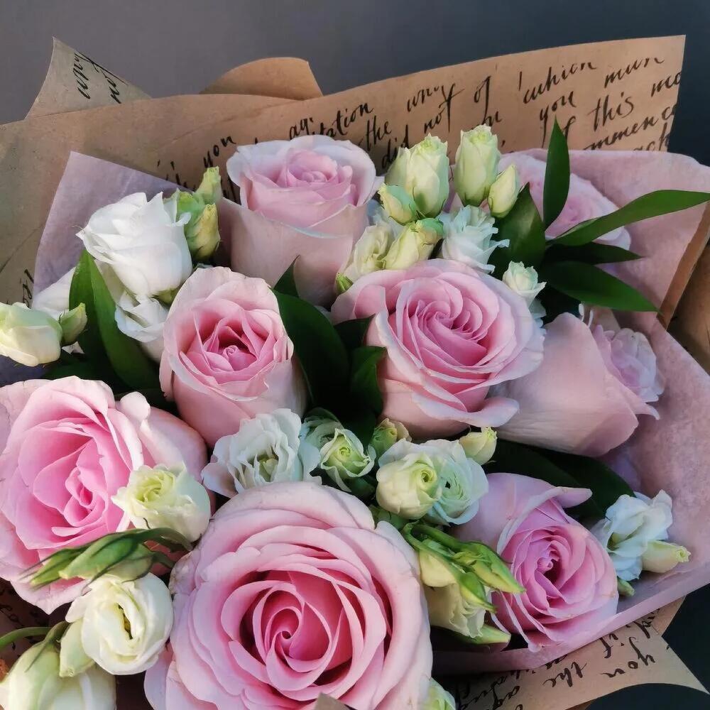 Роза Эквадор – 7 шт.Лизиантус – 3 шт.зелень декоративная – 5 шт.Упаковка дизайнерская – 1 шт.