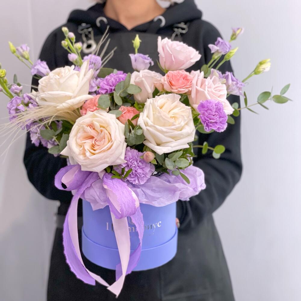 Пионовидная роза – 3 шт.Розовая роза – 3 шт.Гвоздика – 3 шт.Маттиола – 2 шт.Лизиантус – 2 шт.Кустовая роза – 2 шт.Эвкалипт – 2 шт.Фисташка – 1 шт.Ковыль – 1 шт.Шляпная коробка с лентами – 1 шт.