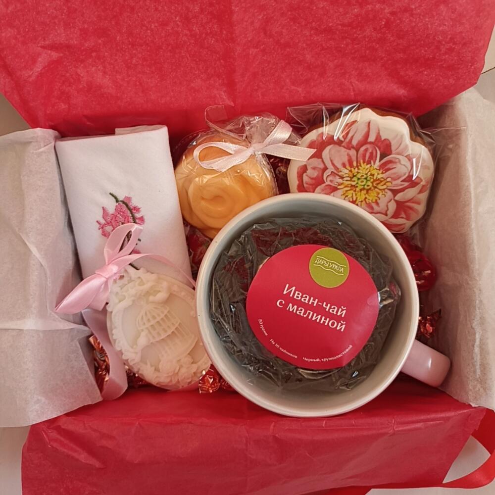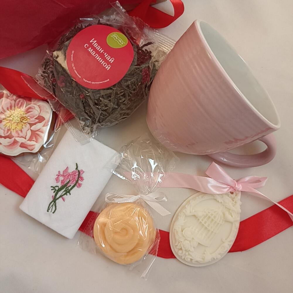 Шоколадные конфеты – 3 шт.мыло ручной работы роза – 1 шт.трюфельные конфеты – 1 шт.choco-pie с клубникой – 2 шт.хлопковый платочек с вышивкой – 1 шт.иван-чай с кусочками малины – 1 шт.кружка (400мл) – 1 шт.ароматное саше манго-бергамот – 1 шт.пряник ручной работы пион (без меда) – 1 шт.
