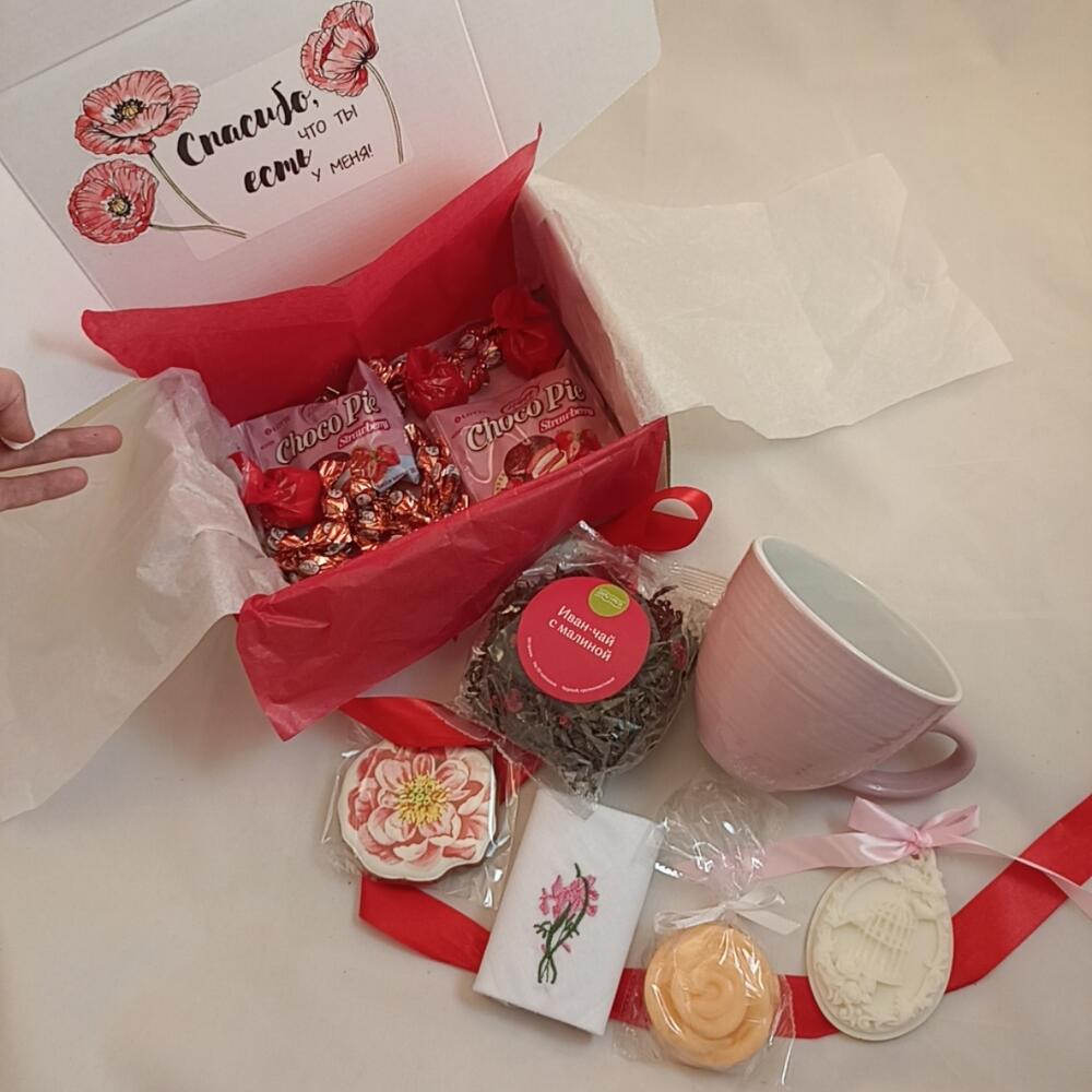 Оригинальный подарочный набор с тем, что может удивить и порадовать любимого человека ❤В подарочный бокс входит:- Иван-чай, собранный в далекой Сибири вручную, с кусочками малины и без ароматизаторов- Кружка (400 мл)- Шоколадные конфеты (3 шт)- Мягкое мыло ручной работы «Роза» (подходит для ухода за кожей лица и нежной детской кожей)- Ароматное саше из воска с запахом «Манго-бергамот»- Пряник ручной работы «Пион» (без меда)- Хлопковый платочек с вышивкой- Choco-Pie с клубникой (2шт)- Трюфельные конфеты в корпусной оболочкеНабор упакован в подарочную упаковку алого цвета и крафтовую коробку с рисунком маков и надписью «Спасибо, что ты есть у меня!» ❤Наши необычные подарки придутся по душе каждой дочке, жене, маме, бабушке, любимой девушке или коллеге. Также поможем удивить отцов, дедушек, сыновей или внуков. Ведь пол и роль не важны, зато бывает так важно подарить чуточку внимания и тепла) А у нас есть все, чтобы Вам с этим помочь ❤Вы можете изменить состав подарочного бокса: -добавить открытку в конверте или без, в которой мы напишем Ваше поздравление- выбрать имбирные пряники с поздравлениями или просто с красивой картинкой- дополнить подарок чаем, брошками, сумками-шопперами, блокнотами, макаронс, кремами, масками для лица, мылом ручной работы- заменить то, что есть в набореДля этого пишите нам Если Вы добавляете позиции к набору, мы бесплатно поменяем упаковку размером побольше и оформим в том же стиле, что и упаковка в товаре. Обязательно пришлëм фото по готовности К каждому заказу кладëм сладкий комплимент. Можем собрать набор, оформить коробку или крафтовую объëмную фигуру, подобрать подарки в цвет, на любую сумму индивидуально для Вашего торжества