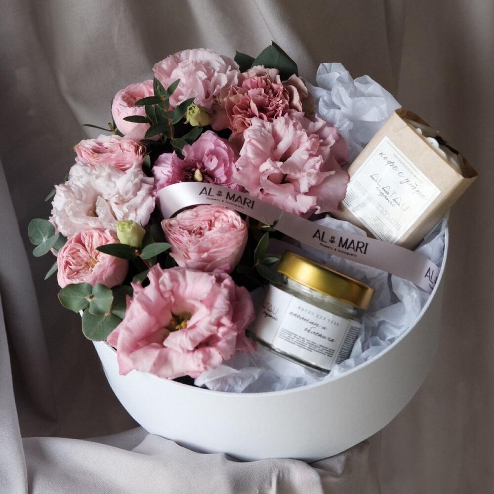 Эустома – 2 шт. Ранункулюс – 1 шт. Коробка – 1 шт. Диантус кустовой – 1 шт. Мыло ручной работы – 1 шт. Спрей роза – 1 шт. масло для тела – 1 шт.