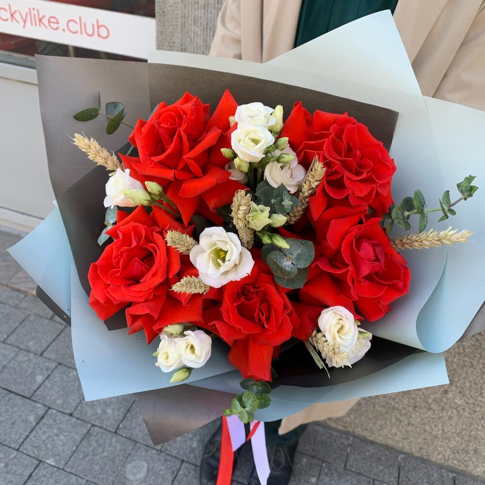 Лента – 1 шт.Эвкалипт – 5 шт.Пшеница – 7 шт.Упаковка дизайнерская – 2 шт.эустома лизиантус – 2 шт.роза французская нина – 5 шт.