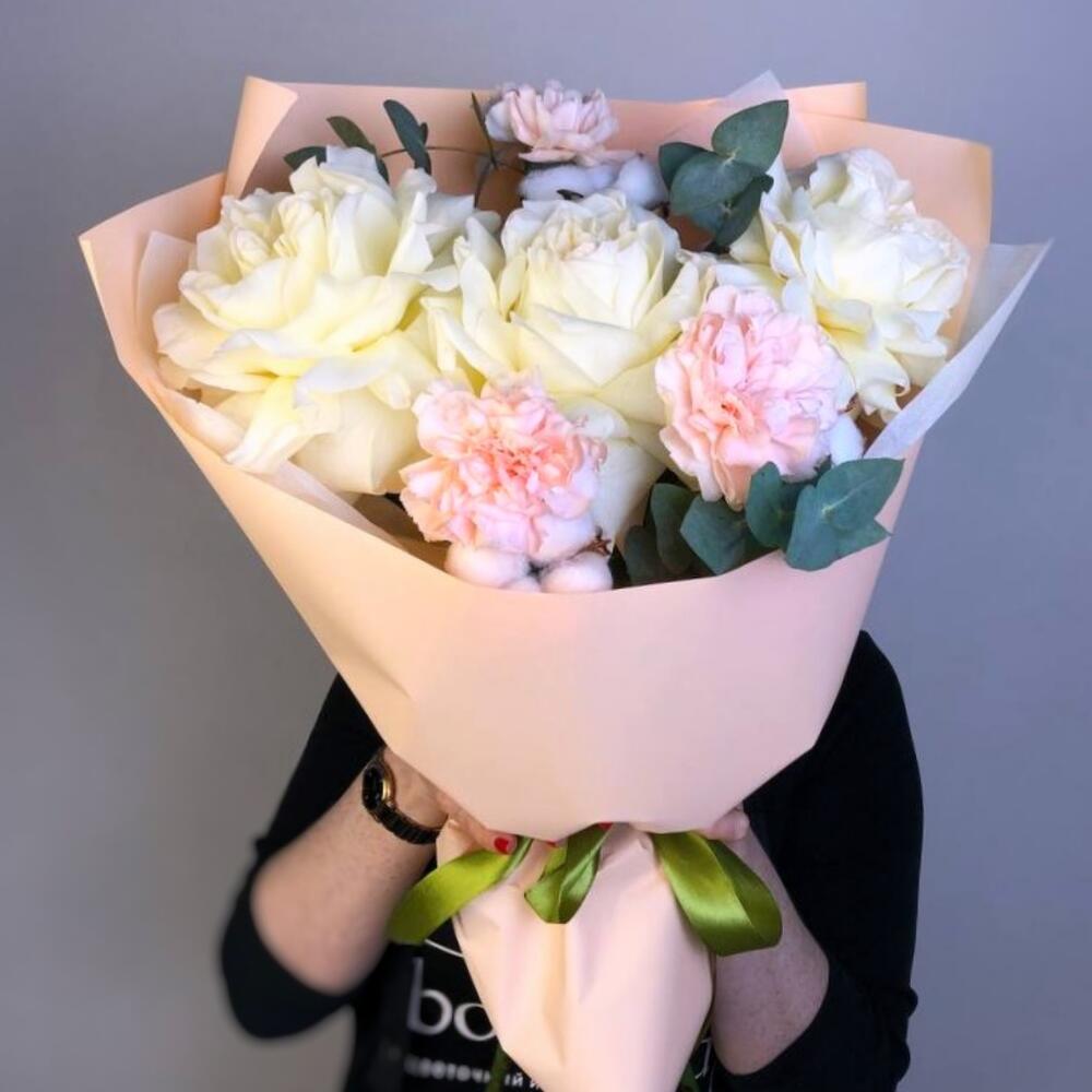 Пышный авторский букет из французской белой розы, розового диантуса и эвкалипта