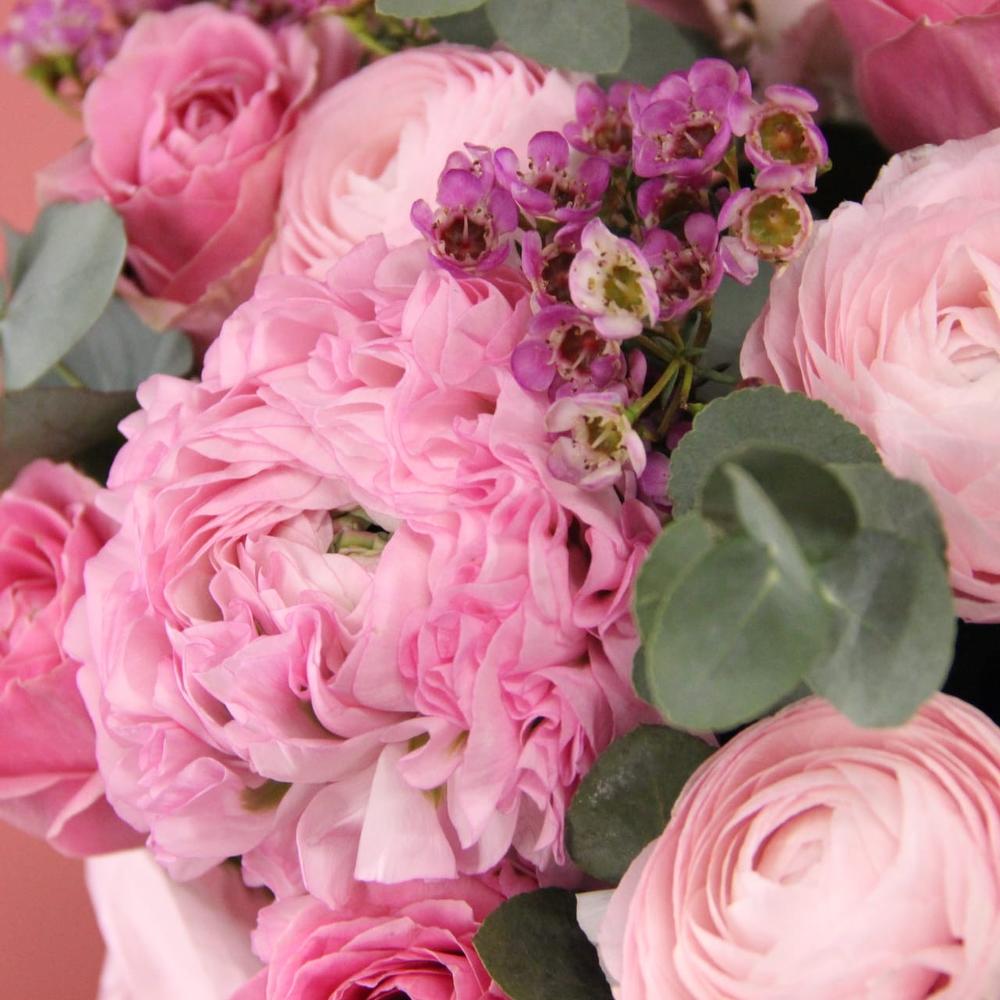 Пион – 3 шт.Роза сортовая – 9 шт.Ранункулюс – 5 шт.Диантус – 5 шт.Ваксфлауэр – 3 шт.Эвкалипт – 7 шт.Коробка шляпная – 1 шт.Оазис – 1 шт.Тишью – 2 шт.