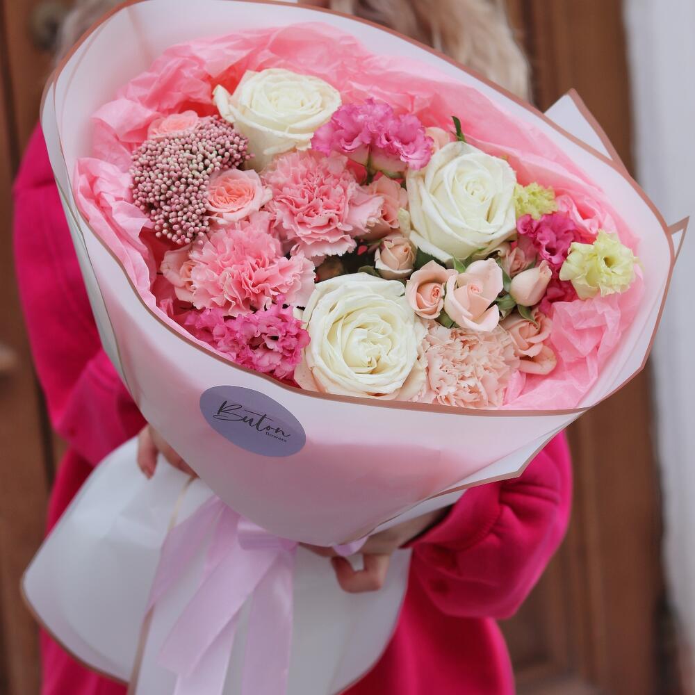 Роза белая пионовидная – 3 шт.Диантус сортовой – 3 шт.Озотамнус – 1 шт.Лизиантус розовый – 1 шт.Роза кустовая – 3 шт.Упаковка дизайнерская – 1 шт.