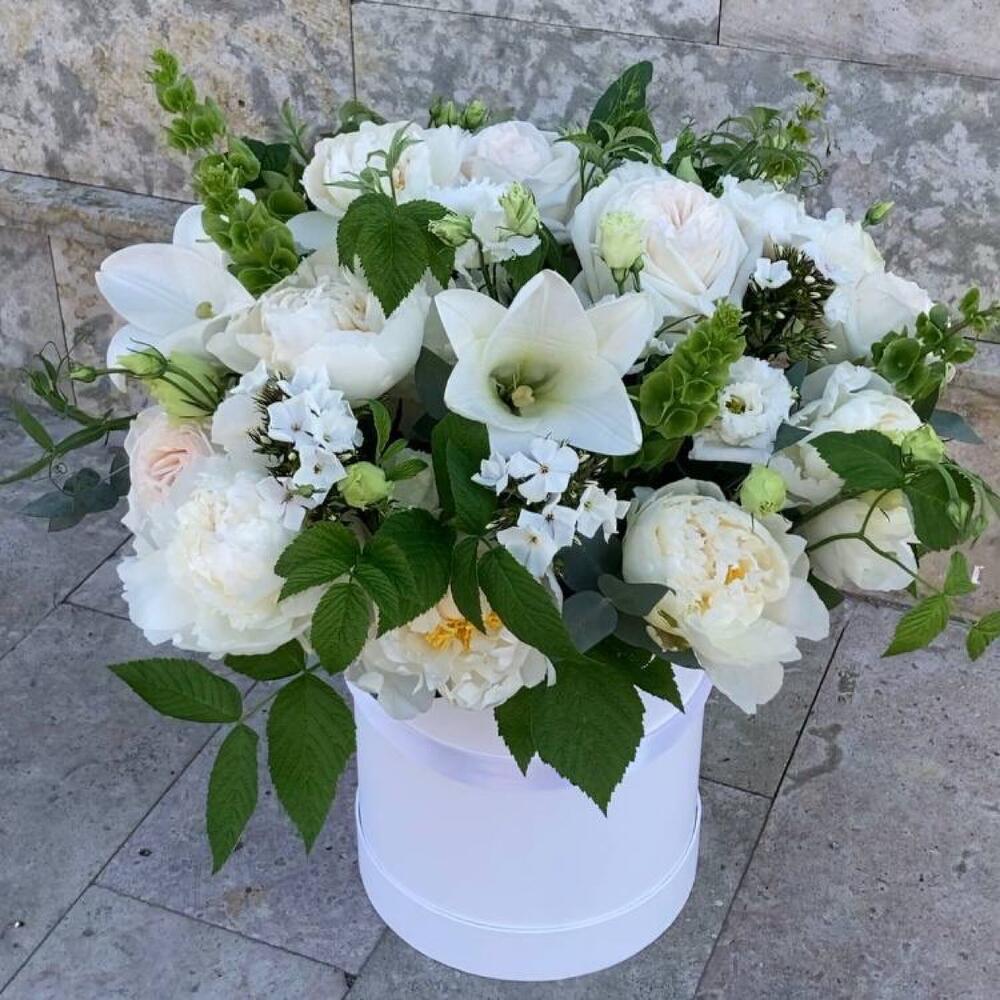 Композиция в шляпной коробке с лилиями, ирландскими колокольчиками, эвкалиптом, пионовидными розами и флоксами.