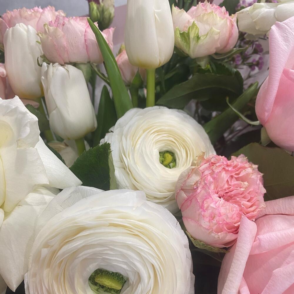 Ранункулюс – 3 шт.плая бланка роза – 3 шт.Pink O’Hara роза – 5 шт.Кустовая пионовидная роза – 2 шт.Тюльпан – 3 шт.Хамелациум – 2 шт.Эустома – 3 шт.Эвкалипт Микс – 3 шт.Упаковка дизайнерская – 5 шт.Лента атласная – 1 шт.